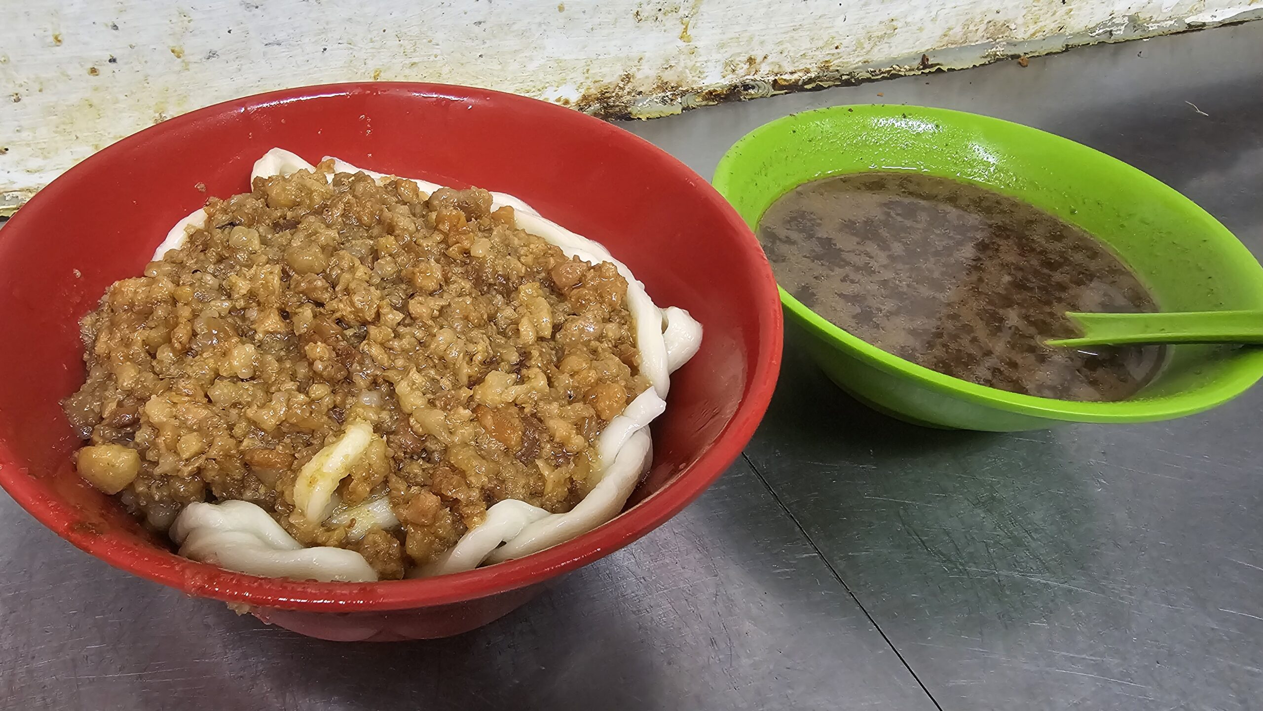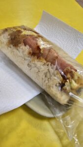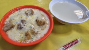 鹹豆漿(卵入り)、熱豆漿、飯糰(ベーコン、卵焼き)、125TWD(現金払い)